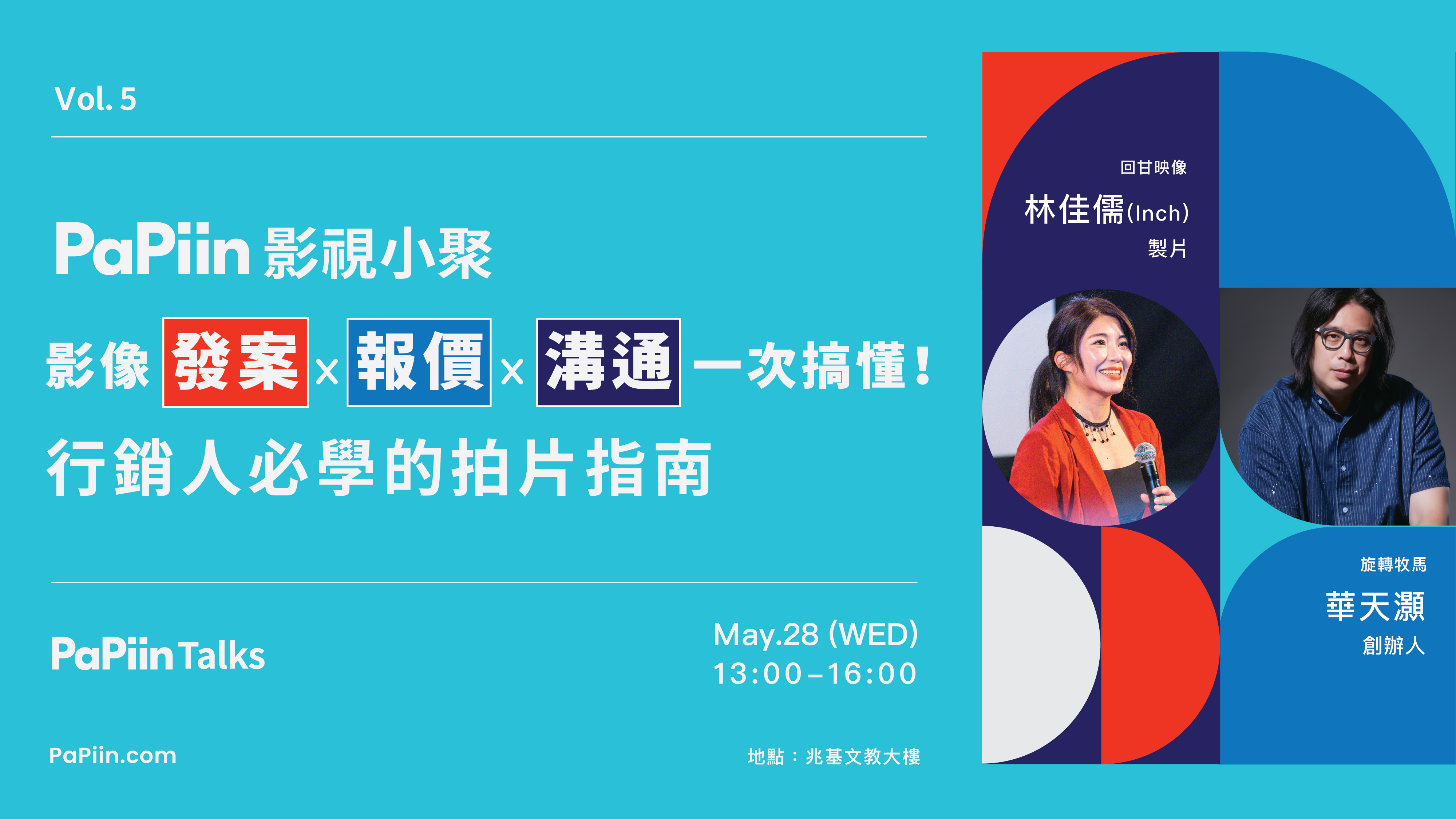 本場 PaPiin 影視小聚將帶你深入解析影像發案流程,從「挑選廠商」、「溝通需求」、「估預算」,到「影音趨勢」,讓你的影像專案更順利。活動適合品牌業主、影音專案人員、社群小編,以及對影音內容趨勢感興趣的行銷人等等。報名請至 Accupass 活動頁報名。
