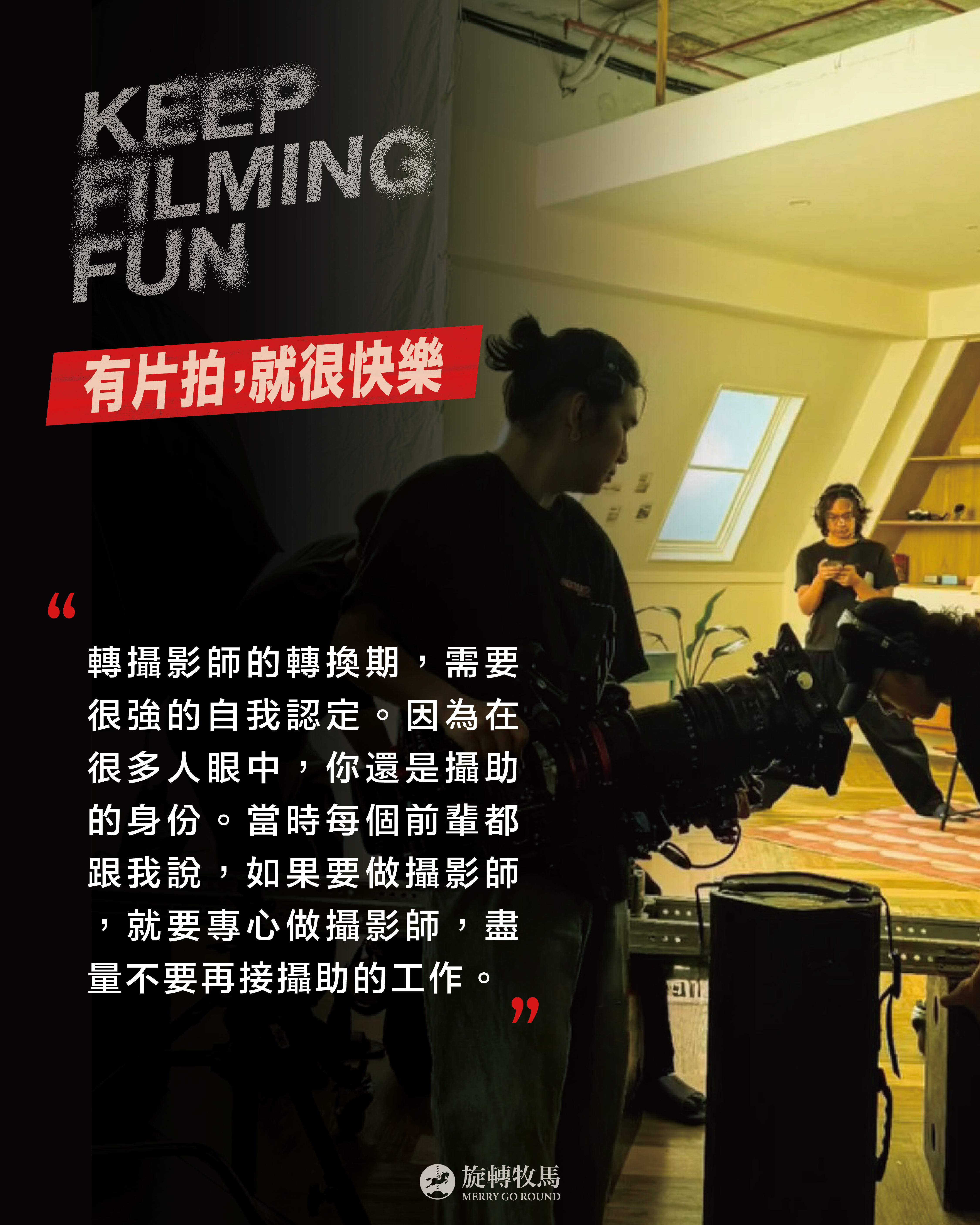 小樂大學唸傳播,卻沒太多拍片經驗。因為亮哥開了器材公司,他誤打誤撞去當實習生,才發現自己真正熱愛的是攝影。從攝助開始,他花了一年時間轉型為攝影師,甚至把攝助時期的裝備全送給學弟,只為了專心走自己的路。