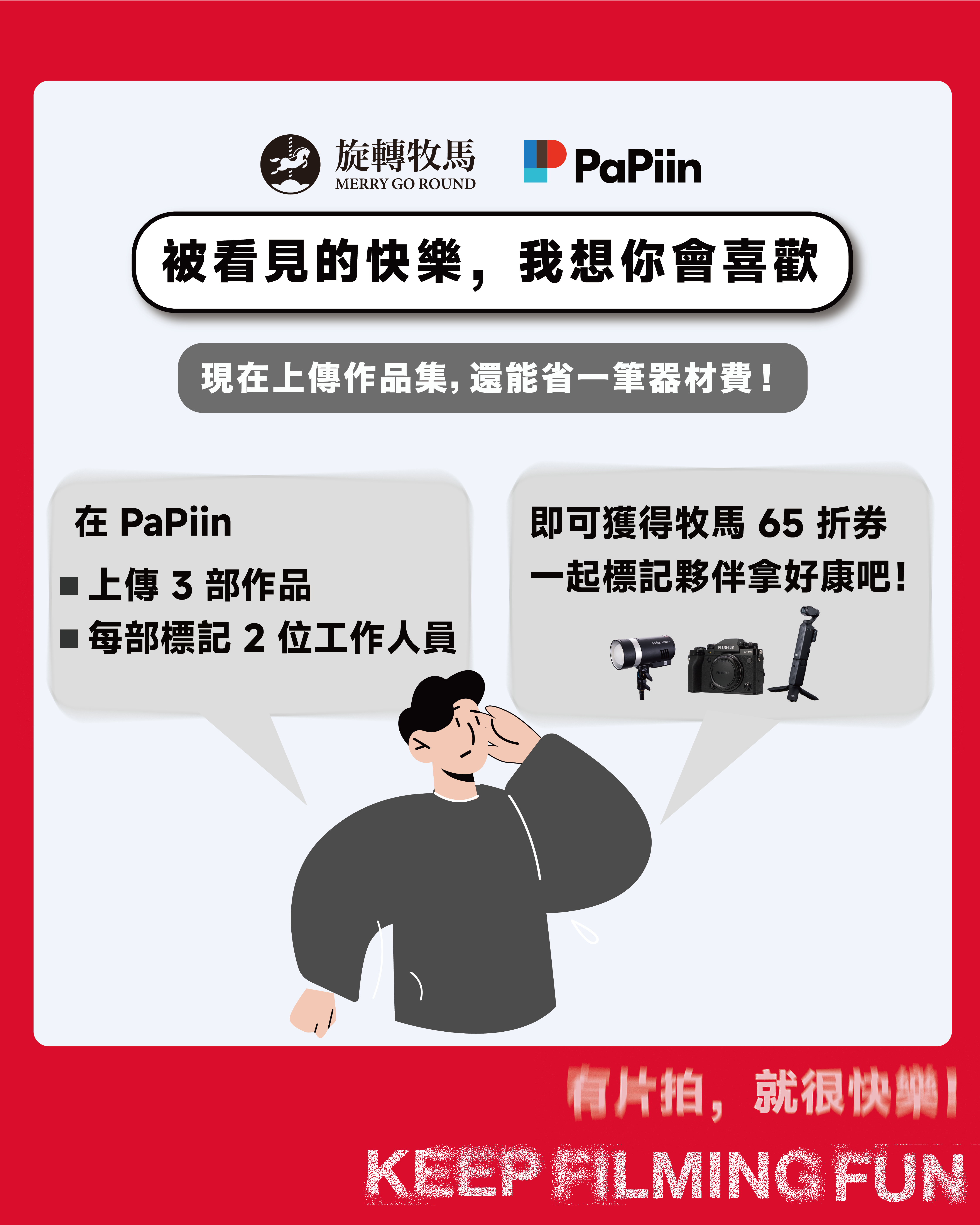 PaPiin X 旋轉牧馬 限時優惠活動!2025/7/1–7/31 上傳 3 部作品並 tag 至少兩位工作人員,即可獲得牧馬器材租借 65 折優惠券。拍片省荷包、裝備再升級!
