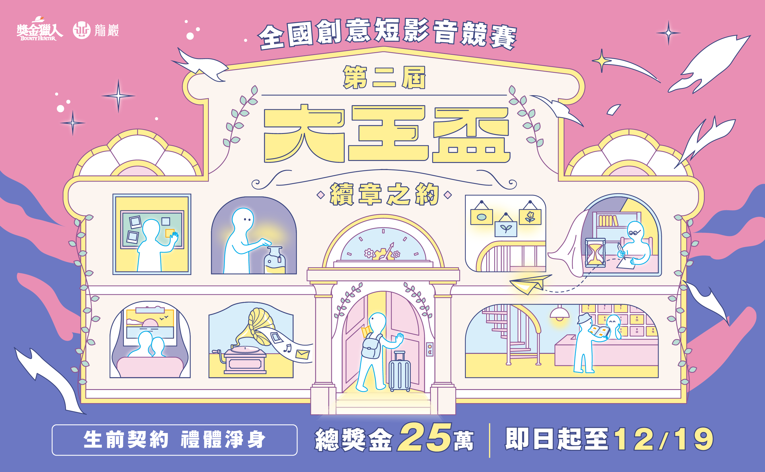 由獎金獵人主辦、龍巖贊助的年度旗艦賽事回歸!第二屆以《續章之約》為題,邀請全台大專院校學生用 90–180 秒短影音,從「生前契約」與「禮體淨身」兩大主題出發,拍出屬於你對愛、記憶與道別的溫柔想像。個人/團隊皆可報名,兩組別可跨題投稿,總獎金 25 萬等你拿!