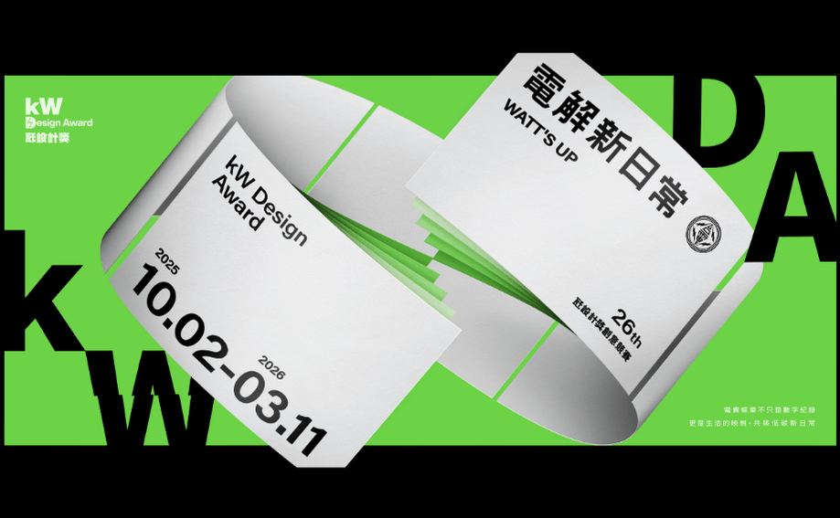 全臺唯一聚焦「電力議題」的創意設計競賽——第 26 屆《瓩設計獎 kW Design Award》正式啟動!本屆以「WATT'S UP 電解新日常」為主題,從帳單出發,邀請設計者用全新視角解讀日常的用電故事。 透過設計的轉譯與想像,讓瓦數、電碼、度數成為創作語彙,重新連結電力與生活,啟發對未來的想像。詳情請見競賽官網。