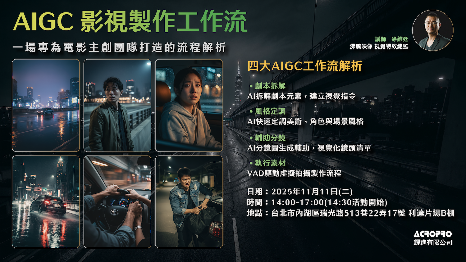 AIGC 正在重塑影視製作流程!本場研討會將帶你從劇本拆解、美術定調到虛擬拍攝整合,全面掌握 AI × Virtual Production 的實戰應用。無論你是導演、製片或創作者,都能在這裡找到未來創作的關鍵節奏。名額有限,歡迎立即報名!