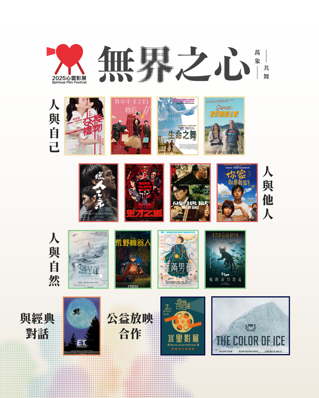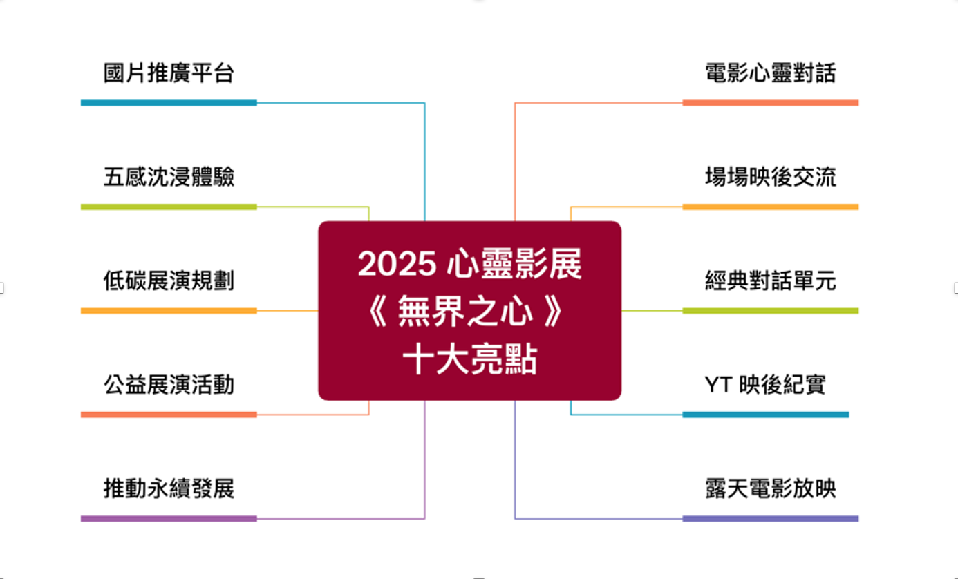 【2025 心靈影展】邀請你跳脫框架、開啟一場靈魂與宇宙共振的影像旅程!今年以主題「無界之心.萬象共舞」,探索如何在分歧的時代中,以影像為橋樑,跨越人我界限、連結萬物共生,用15 部精選電影 × 4 場主題工作坊,融合心靈療癒、永續行動與低碳展演,讓觀影成為一次內在成長與共感的體驗!