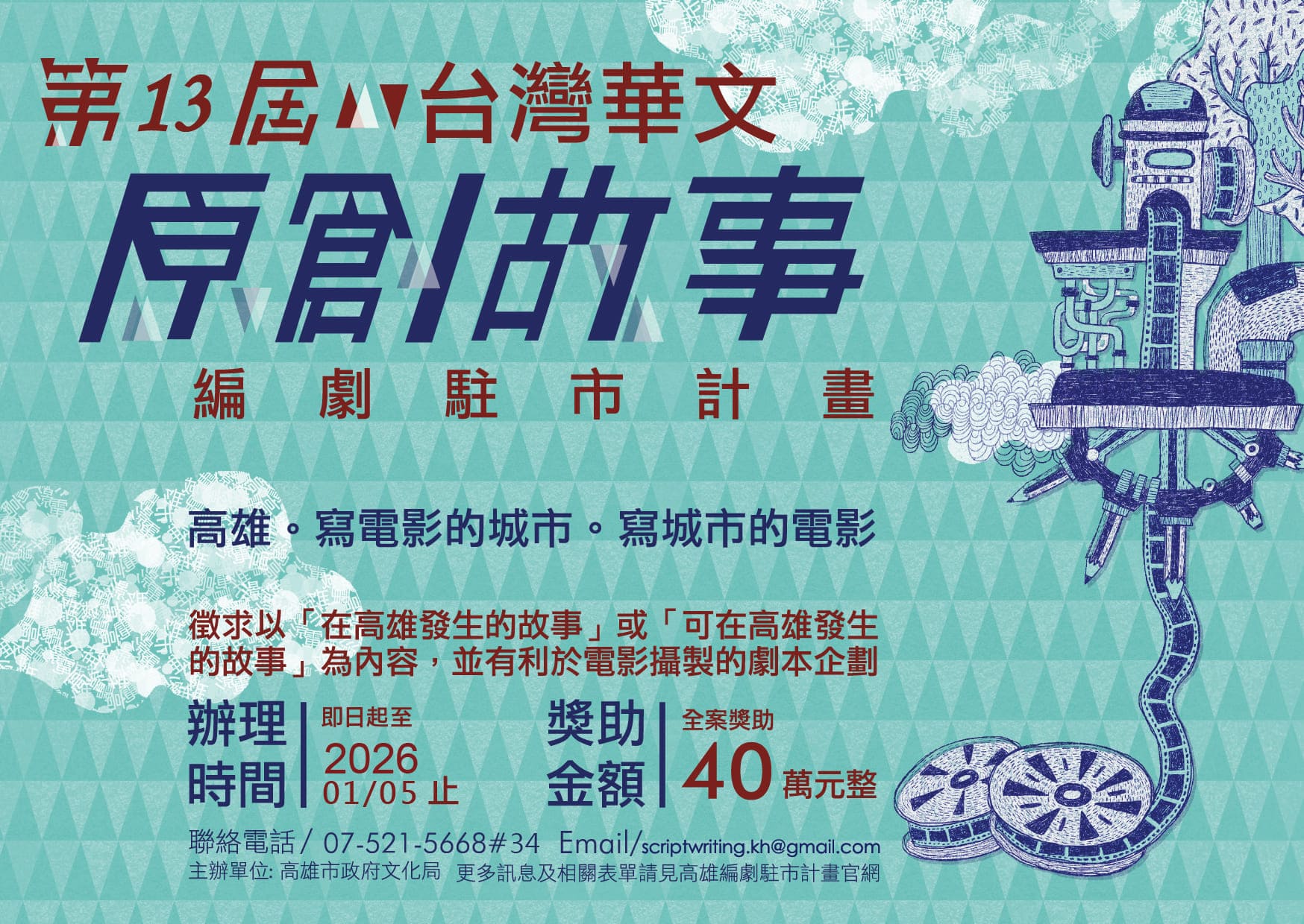 高雄市政府文化局(以下簡稱本局)為發展本市影視產業,讓高雄成為華文世界故事創作基地,以台灣自由土壤之優勢,開啟創作動能,培養優秀人才,特公開徵求編劇駐市以開發專屬高雄、擁有高雄氣味的劇本。詳情請見補助官網。